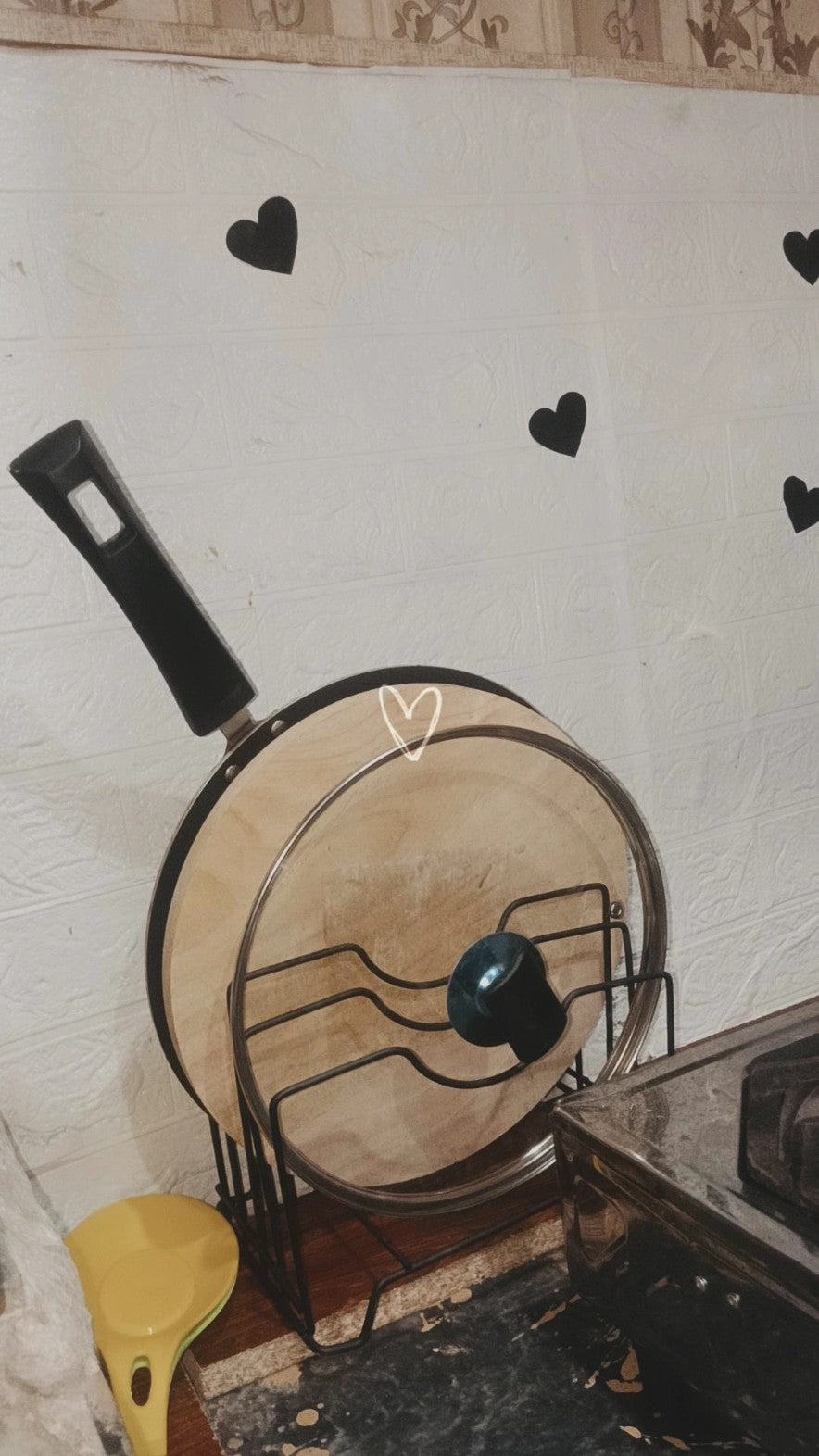 Description Made up of iron art material, the pot lid holder features high durability and smooth surface, securely welded. Overly smooth and uneven surface protects you from hurting yourself. It is a kitchen shelf to hold Dishes, pot, Lid, cutting board, saucepan, etc There are notches on each layer, which allows you to put the pot lid on, fasten it tightly. Great gift that you can give it to your friends and family in housewarming party. Dish rack is made of durable material .